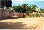 Private tennis court: Family red clay court in garden.